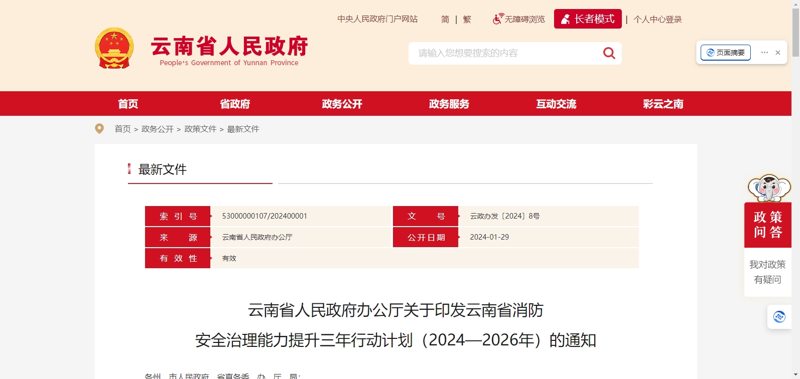 云南省人民政府辦公廳關于印發(fā)云南省消防 安全治理能力提升三年行動計劃(2024—2026年)的通知