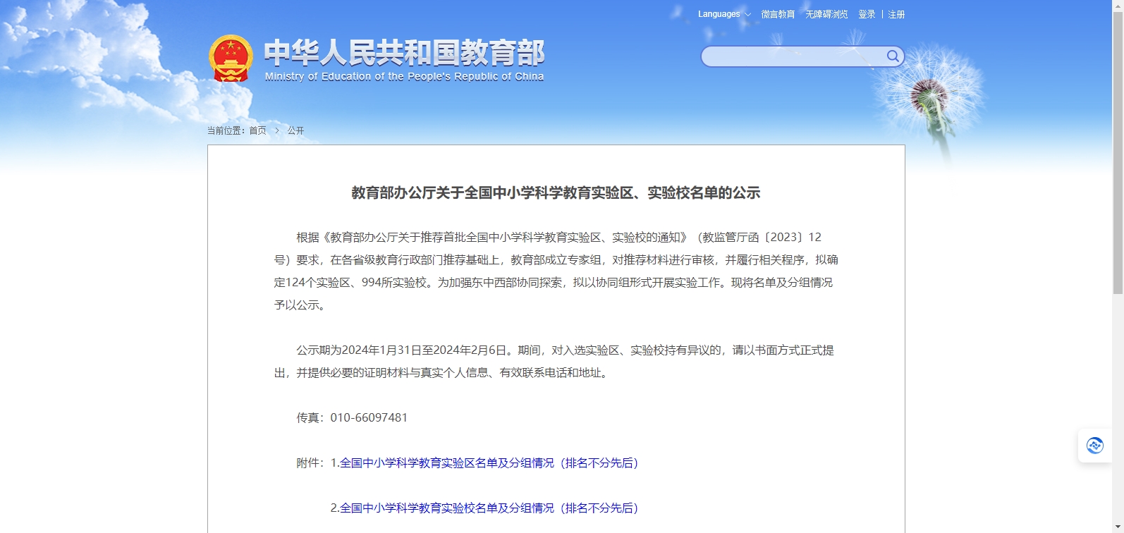 教育部近日公示全國中小學科學教育實驗區(qū)、實驗校名單,在各省級教育行政部門推薦基礎上,教育部擬確定124個實驗區(qū)、994所實驗校。公示期為2024年1月31日至2024年2月6日。